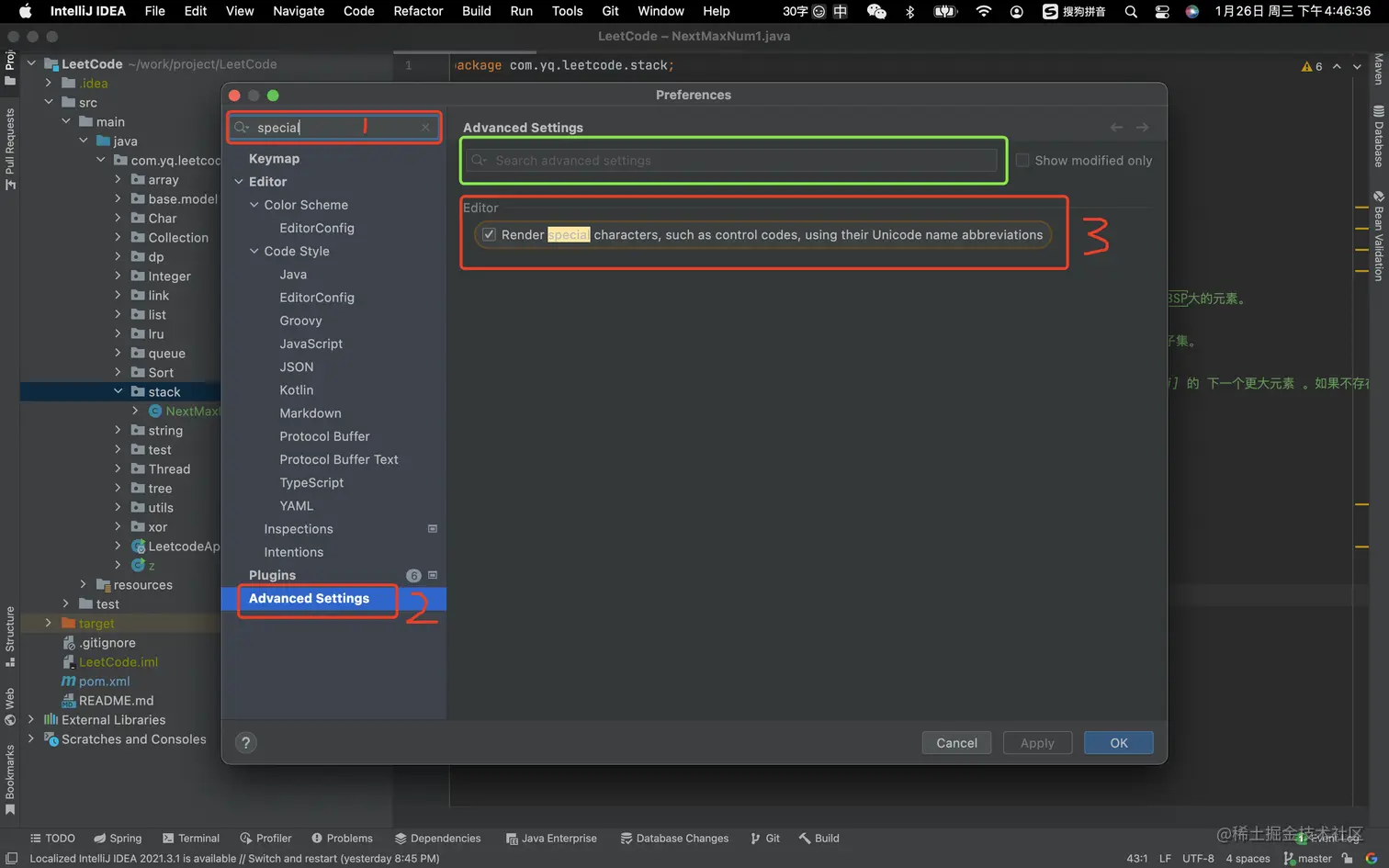 IDEA 2021.3.1 出现 NBSP 空格 是科科鸭 2022-01-26 1,446 阅读1分钟 1、设置 mac:preferences Windows: Settings 2、搜索关键词: special 3、选择: Adcanced Settings 4、取消右侧勾选: ☑️ Render special characters, such as control codes, using their Unicode name abberviations 下图示例