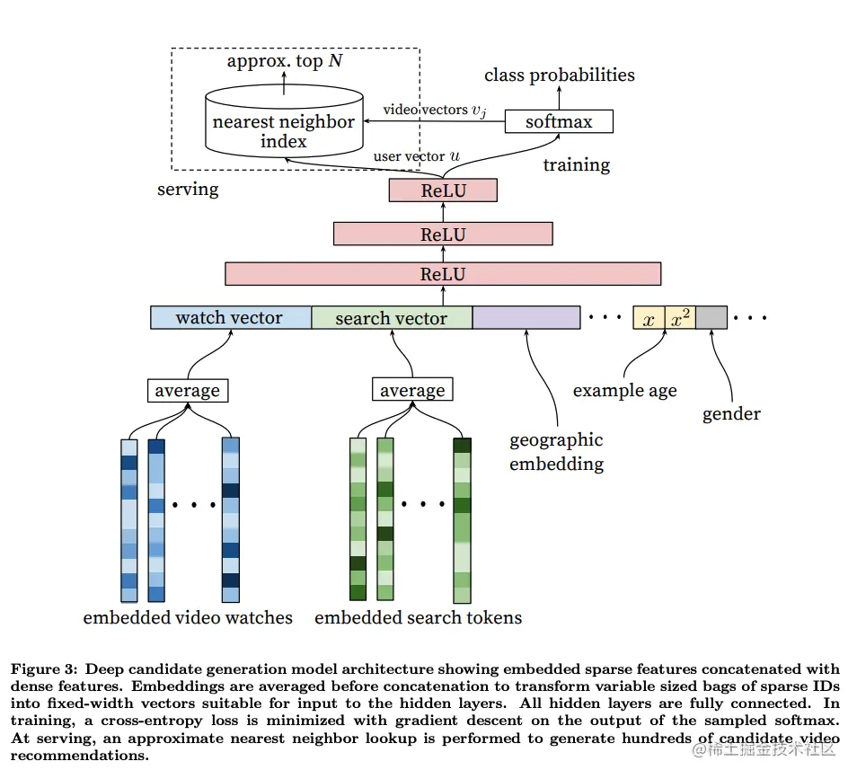 由上图可以看出,最底层的输入是用户观看过的 video 的 embedding 向量,以及搜索词的embedding向量,特征向量里面还包括了用户的地理位置的 embedding,年龄,性别等。然后把所有这些特征 concatenate 起来,喂给上层的ReLU神经网络。三层神经网络过后,经过 softmax 函数得到最后输出。