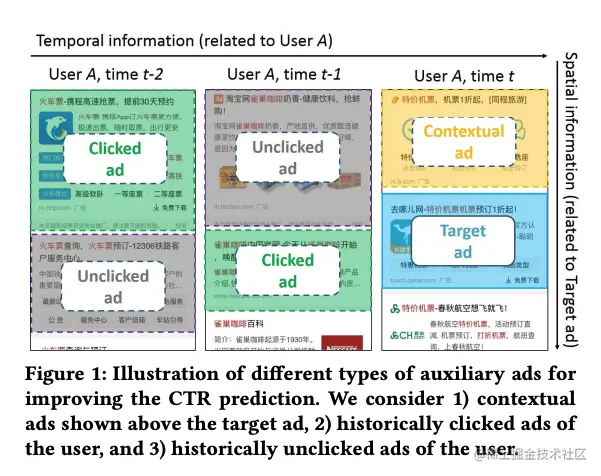 在传统方法当我们要预估对一个广告的点击概率时,只考虑该广告的信息,而忽略了其他广告可能带来的影响。如用户历史点击或者曝光未点击的广告、当前上下文已经推荐过的广告等。因此,将这些广告作为辅助信息,加入到模型中,也许可以提升CTR预估的准确性。