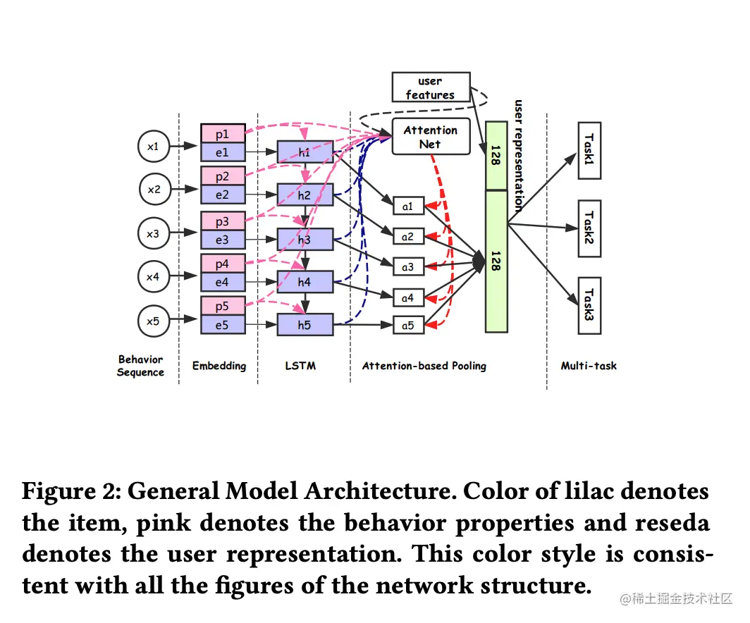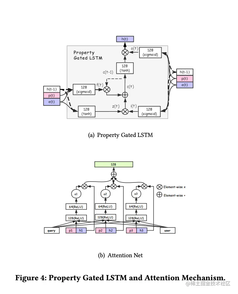 在本论文中,作者在 RNN 和 Attention 中都考虑了行为的属性信息 (场景、时间、行为类型等),如下图所示: