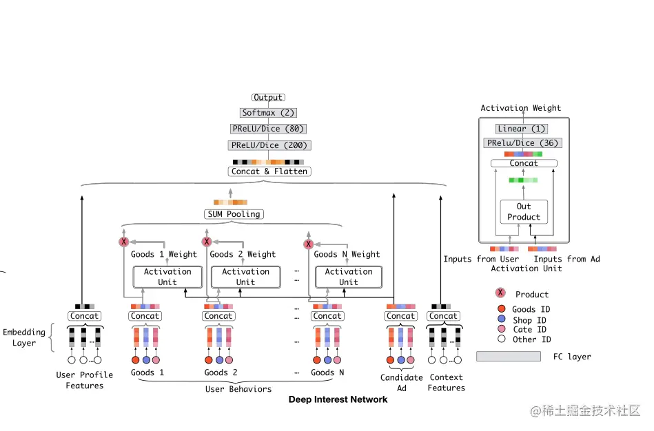 传统的Attention机制中,给定两个 item embedding,比如 u 和 v ,通常是直接做点积 uv 或者 uWv ,其中 W是一个 |u|x|v| 的权重矩阵,但 din 更进一步的改进,在上图右上角的activation unit 中,首先是把u和v以及u v的element wise差值向量合并起来作为输入,然后喂给全连接层,最后得出权重,这样的方法显然损失的信息更少。