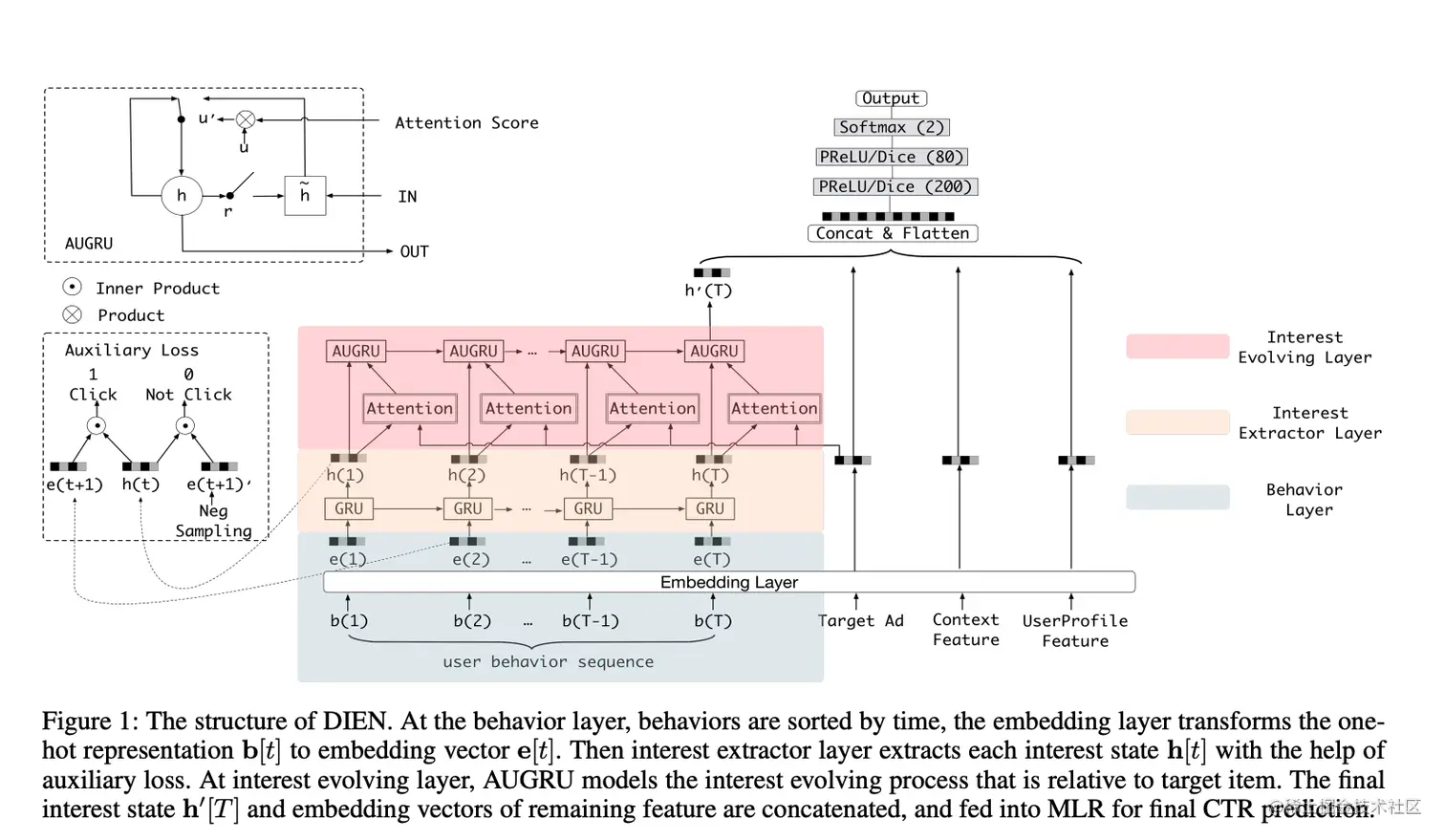 DIEN [12] 基于双层RNN来建模用户的商品点击序列,应用在电商APP推荐广告排序中。同时,在模型提出了基于RNN中的隐藏向量和下一个商品计算辅助loss。第一层RNN,直接用来建模用户的商品点击序列;第二层RNN,基于第一层RNN的结果、待排序广告计算attention,用于RNN的更新。