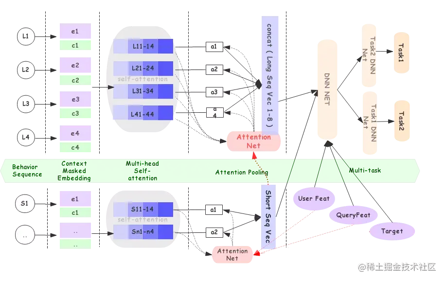 对于近期序列和端上点击序列,使用self-attention建模,然后使用user和query来解码得到用户近期兴趣向量。 DMT中是推荐系统所以使用target item来解码,AliSearch是搜索任务,所以使用user和query来解码(搜索对相关性要求高、不需要使用每个待排序商品解码效率更高)。