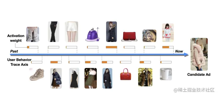 如图1所示,在电商推荐中,用户的序列特征包含了和用户发生过交互的各种商品。箭头下方包含了用户的行为序列,上方是 DIN[9] 方法中对发生交互关系的各种商品赋予的不同的权重。然后根据所有的这些特征共同得到最后用户的推荐序列。