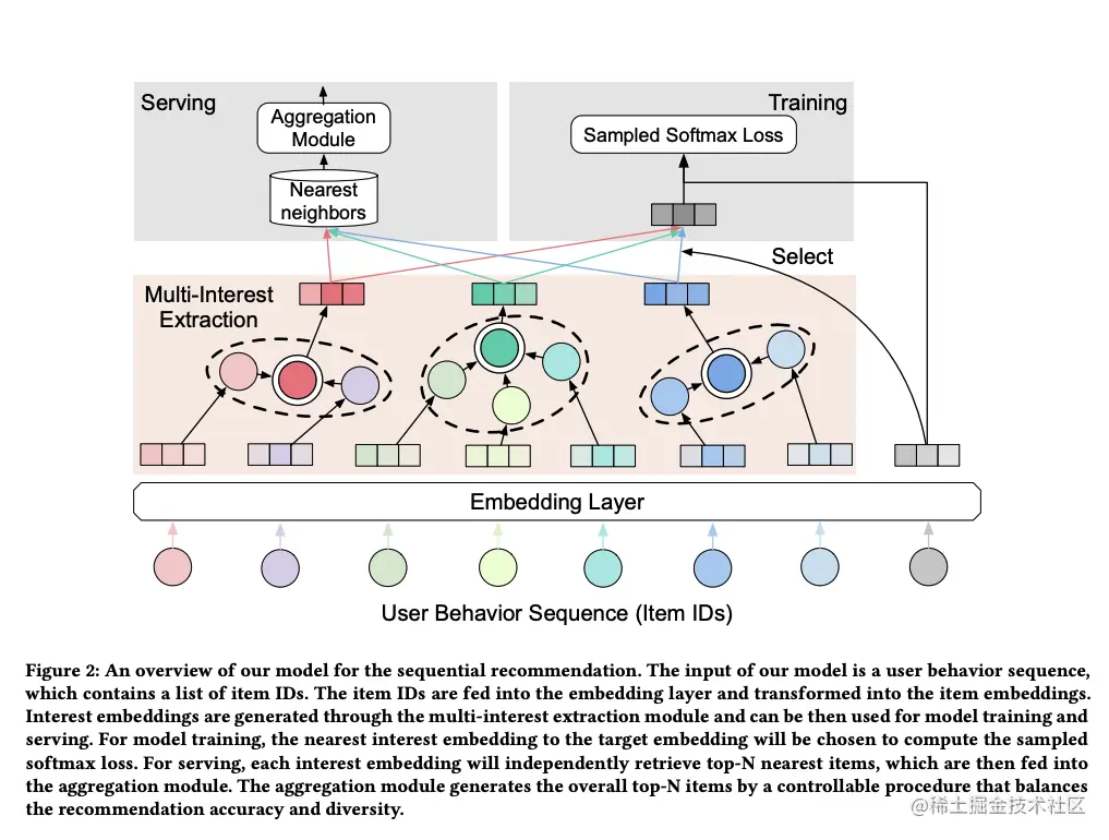 ComiRec [15] 提出基于Capsule或Self-attention来建模行为序列,得到用户的多个兴趣向量,并使用一个可控的多兴趣召回结果聚合模块来平衡召回结果的准确性、多样性,应用到电商APP推荐召回模块中。