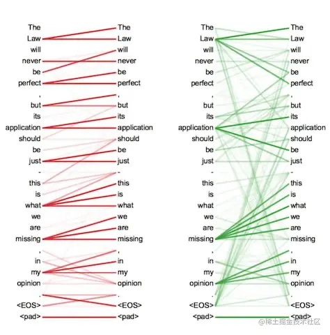 这里面Multi-head Attention其实就是多个Self-Attention结构的结合,每个head学习到在不同表示空间中的特征,如下图所示,两个head学习到的Attention侧重点可能略有不同,这样给了模型更大的容量。