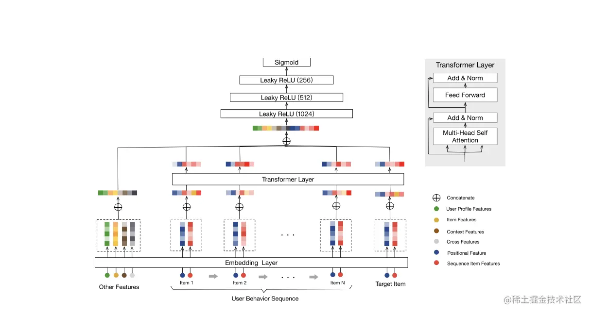 Embedding 层主要分为 Other Features, User Behavior Sequence, Target Item, Other Features 主要包括用户的基本特征、目标物品的基本特征、上下文信息、交叉特征等,先将每个大的种类特征内的所有内容进行拼接,再分别进行embedding映射为一个低维向量,最后得到一个embedding矩阵。User Behavior Sequence:由于表示一个序列特征,且不使用RNN神经网络,因此需要一个 Positional Feature 表示相对位置,Sequence Item Features表示历史物品信息。