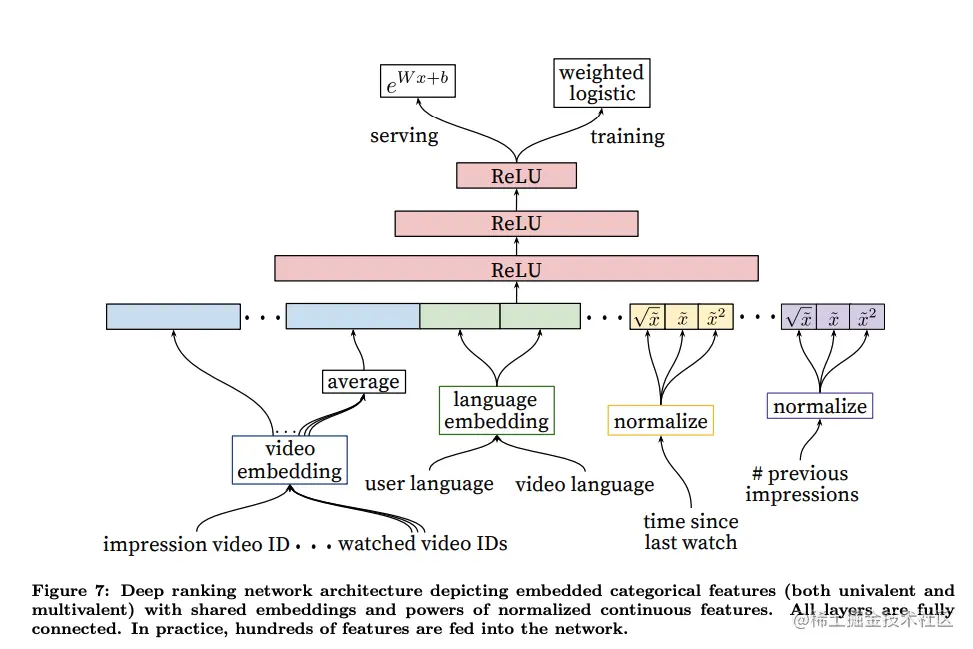 排序阶段引入另一套 DNN 作为ranking model的目的就是引入更多描述视频、用户以及二者之间关系的特征,达到对候选视频集合准确排序的目的。