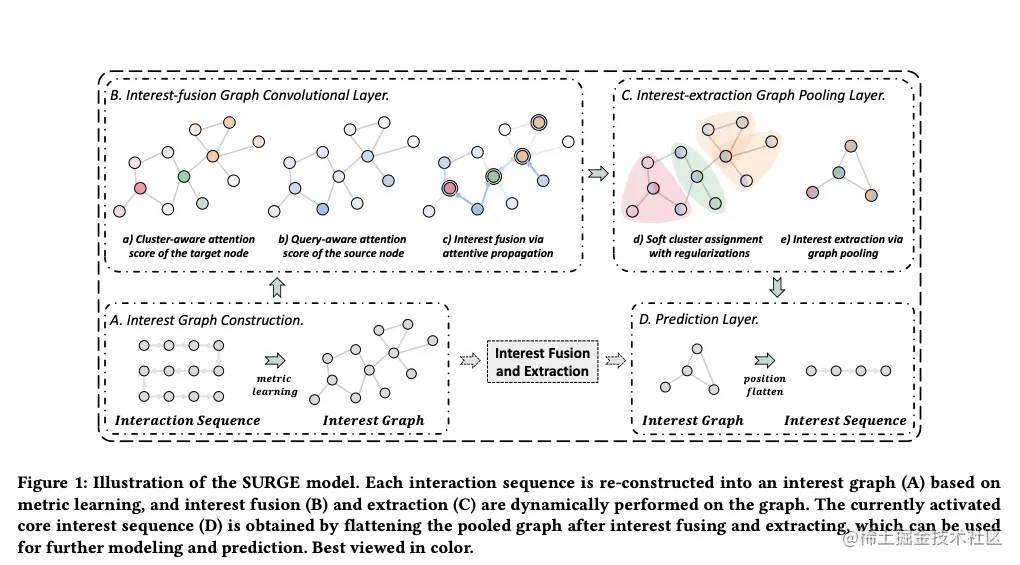 在 SIGIR2021 中,Chang 等人将图卷积应用在序列特征建模中,提出 SURGE (SeqUential Recomendation with Graph neural nEtworks) 模型[3]。该模型主要分为四大部分,包括兴趣图构建,兴趣融合图卷积,兴趣图池化,和预测层。模型的框架如下图所示: