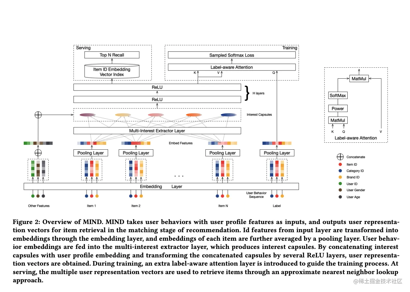 在训练阶段,要进行预测的 label 只有一个 embedding,而用户有一组,没法直接求内积计算匹配度,这里MIND提出了Label-aware Attention,思路跟DIN是一致的,就是根据label的embedding对用户的一组embedding分别求出权重(所谓label-aware),然后对用户的一组embedding求加权和,得到最终的一个embedding。图中右上角是Label-aware Attention的图示,K,V都是用户embedding(矩阵),Q是label embedding(向量),K、Q相乘可以得到不同的用户embedding对label的响应程度,Power对求得的响应做指数运算(可以控制指数的大小),从而控制attention的程度,指数越大,响应高的用户embedding最终权重占比越大。Softmax 对结果进行归一化,最后一步的 MatMul 求得加权和。