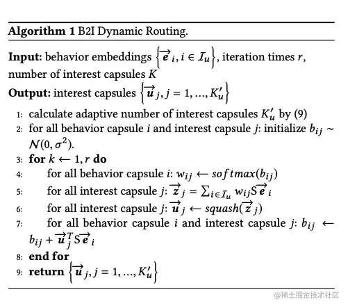 MIND 借鉴了Hiton的胶囊网络(Capsule Network),提出了Multi-Interest Extractor Layer来对用户历史行为embedding进行软聚类,算法如下: