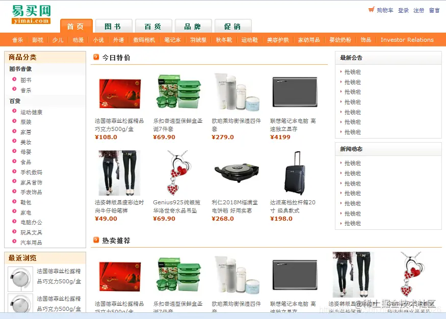 首页包括登录,导航,新闻动态,热销商品列表、最近浏览商品等。