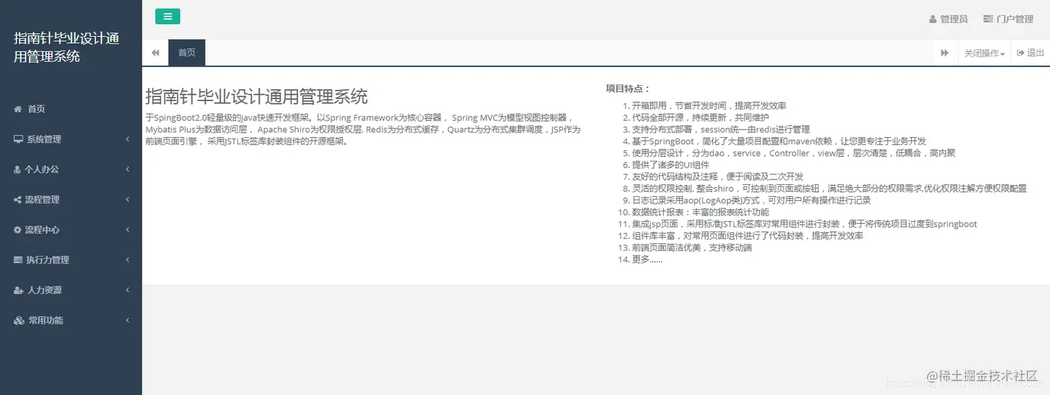 - 集成jsp页面,采用标准JSTL标签库对常用组件进行封装,便于将传统项目过度到springboot
