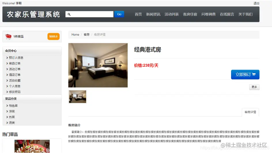 系统前端用户可以注册为会员,登陆后可以实现相关模块信息的浏览,以及预定房间,购买活动,购买菜品,在线留言,参与在线调查统计,查看新闻信息。并可以查看自己的订单信息,并对个人相关信息进行管理操作。