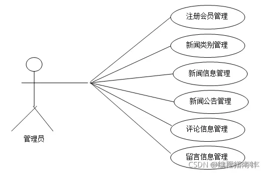 新闻管理系统的主要用例就是管理员用例了管理员管理的如下:1.注册会员、2.新闻类别、3.新闻信息、4.新闻公告、5.新闻评论信息、6.留言信息管理等,用例图3.1图3.2所示。