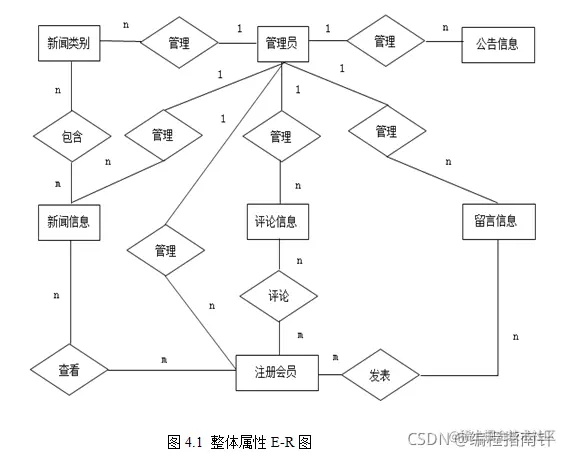 数据表的设计思想我是首先建立一个E-R图模型,然后就是确定数据库表之间的关系图解,在E-R图用长方形来展示实体名称,实体名称在长方形框中写明此名称,椭圆的形状是用来展现实体具备的属性,菱形联系实体,并标明名称,再用无向边把模型中所有的图联系起来[8]。数据概念模型设计如图4.1所示。