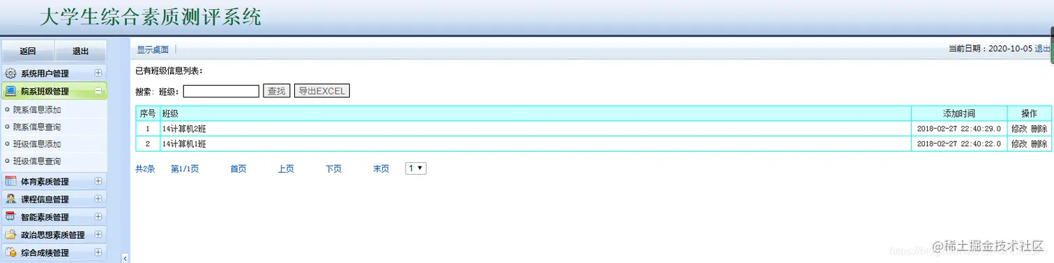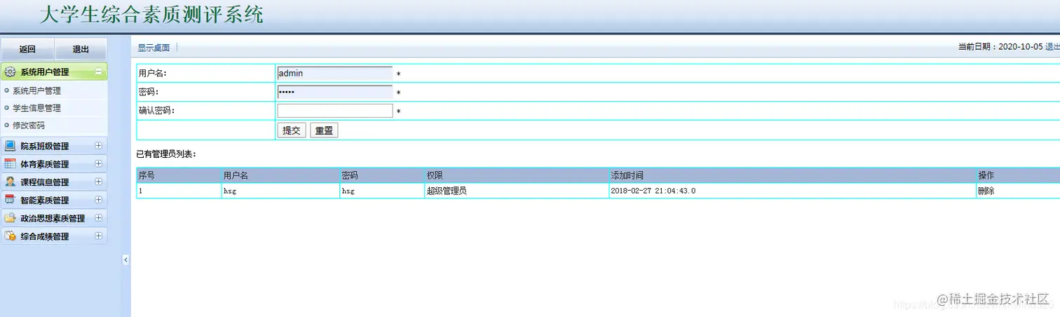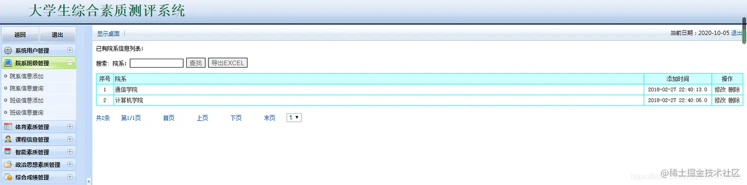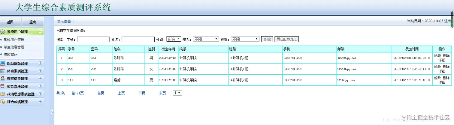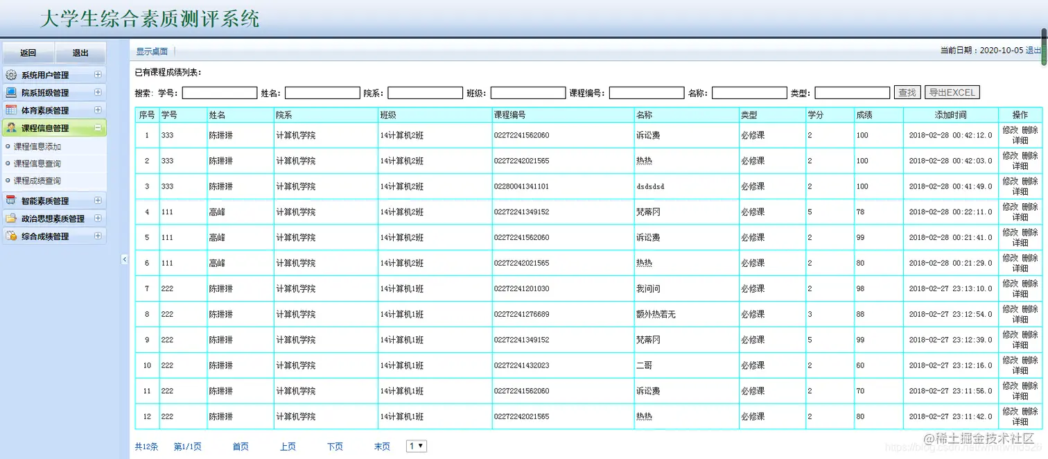 大学生综合素质测评系统:包含用户管理,学生管理,院系管理,课程管理,各种测评成 管理等,数据可以导出EXECL,分用管理员用户和学生用户,管理员管理信息,用户查看自己的成绩信息。