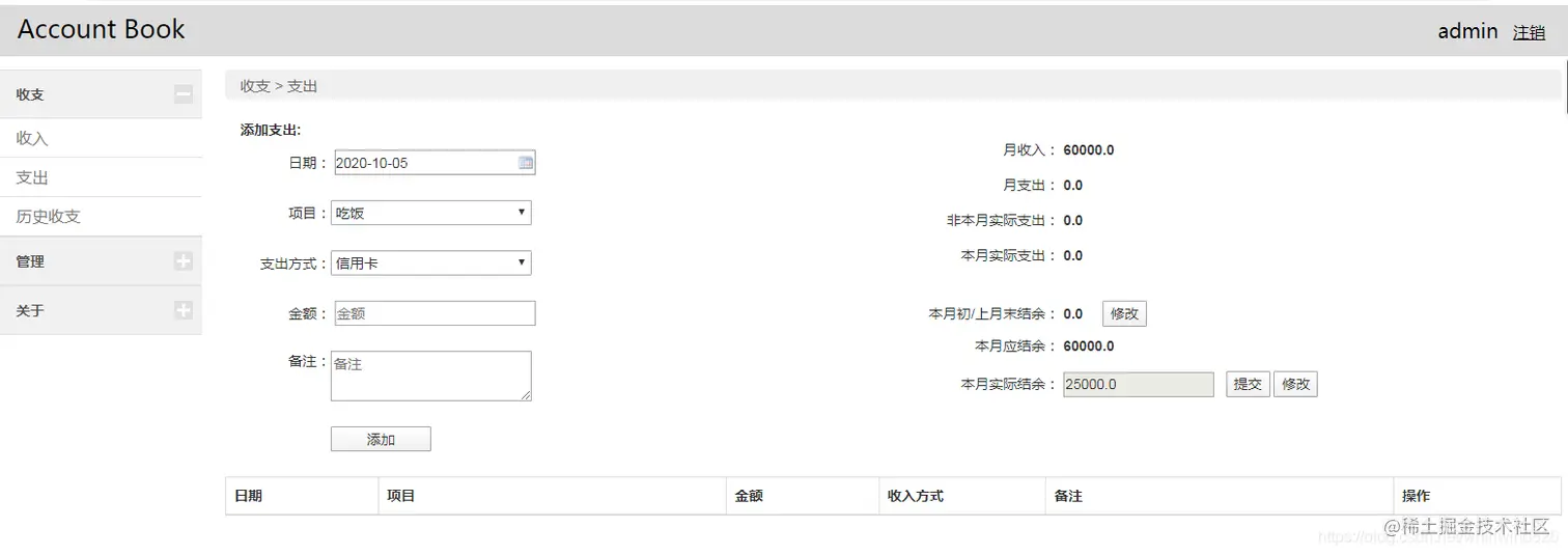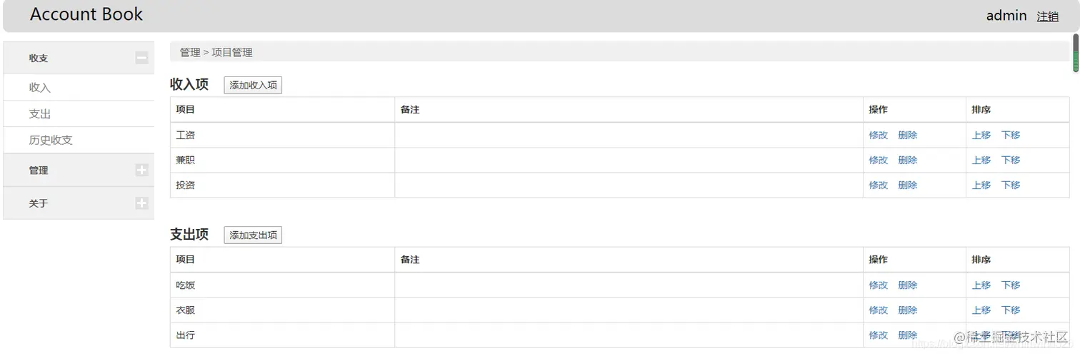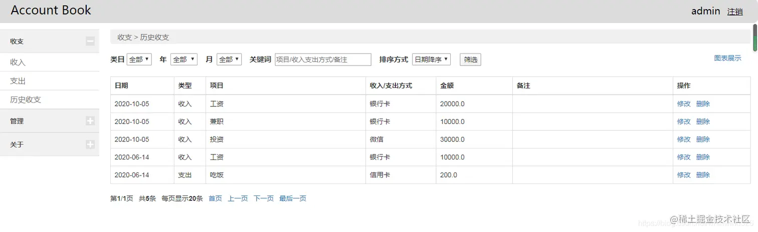 收支项目管理、收支方式管理,个人收入管理、支出管理,历名收支查询统计:图表统计和列表统计等。