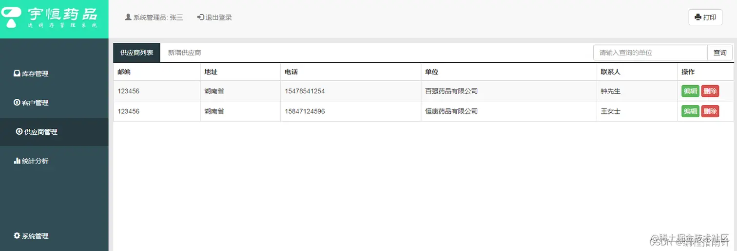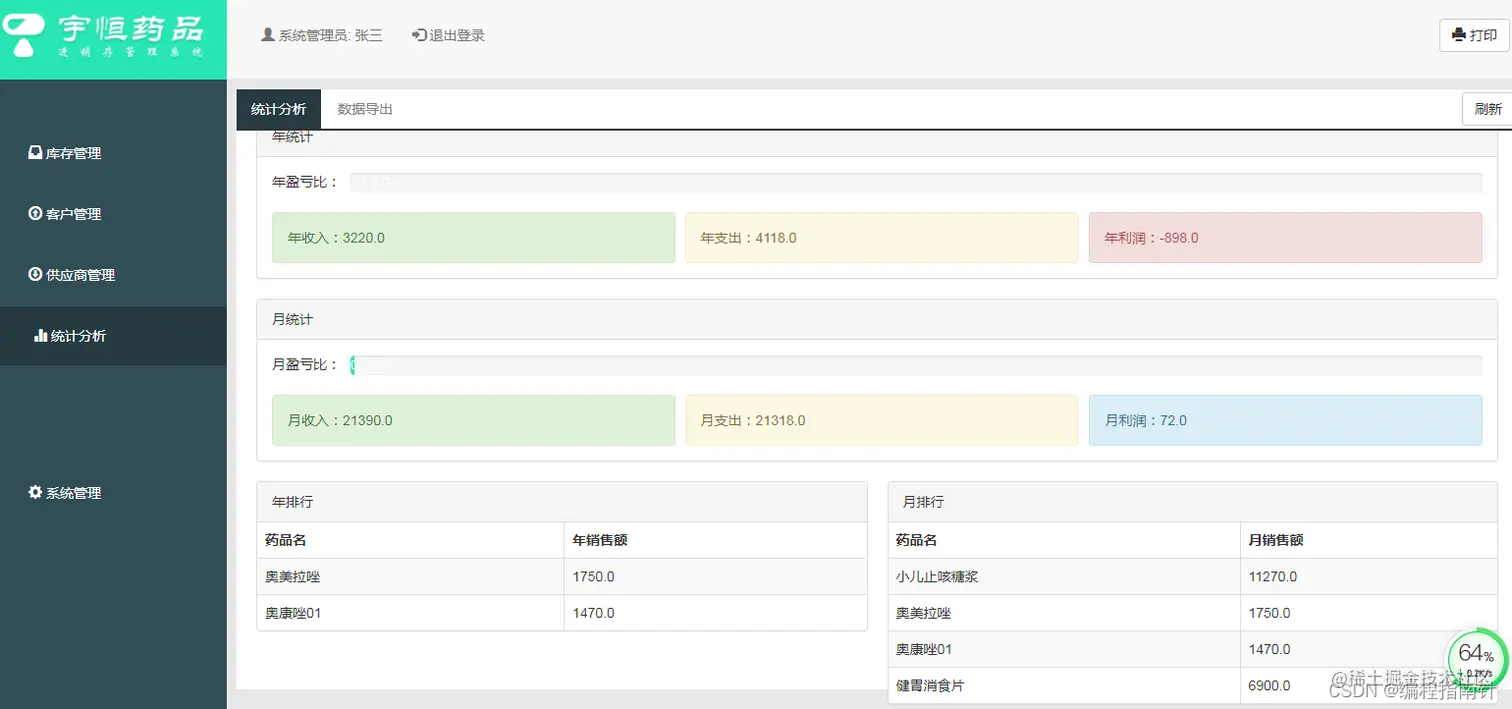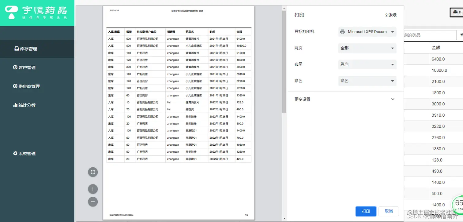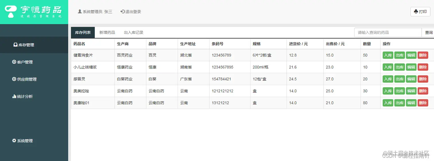 主要实现的功能包含:药品的进销存操作、客户管理、供应商管理、经营数据统计、数据导出、系统管理等模块