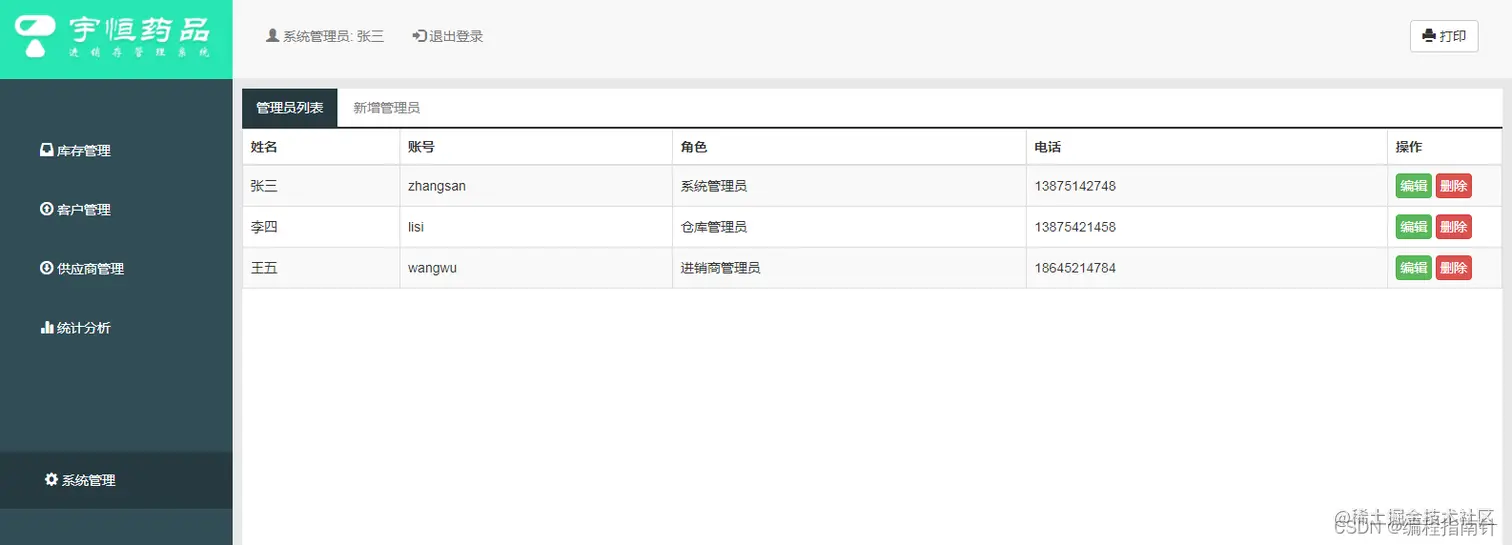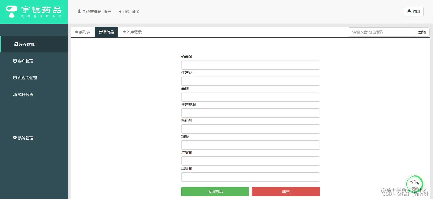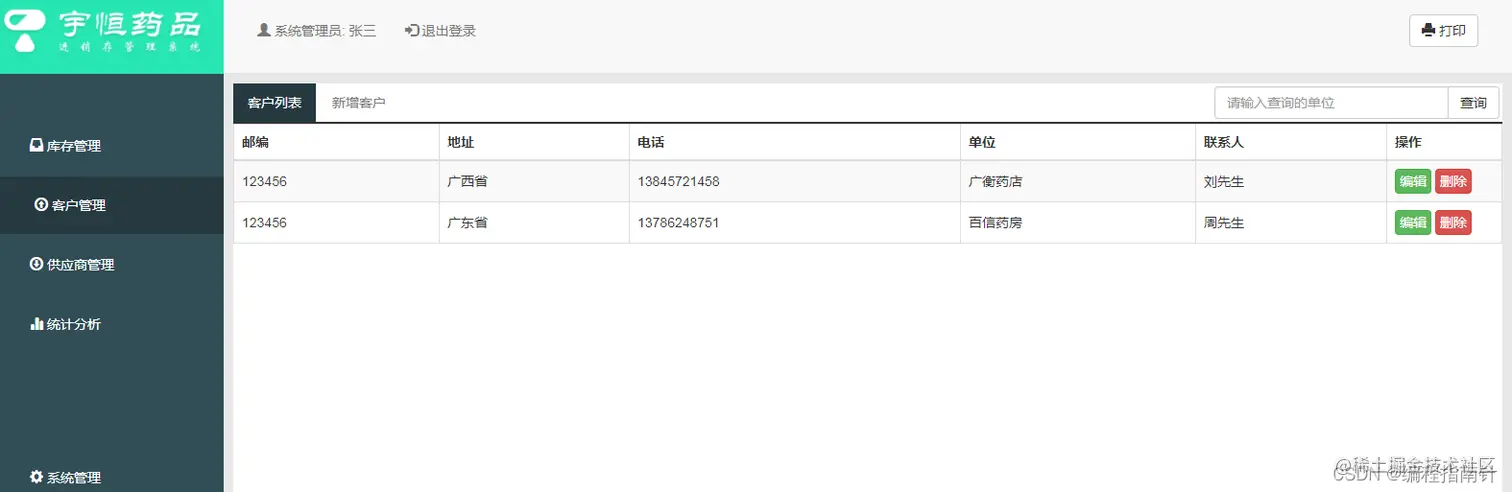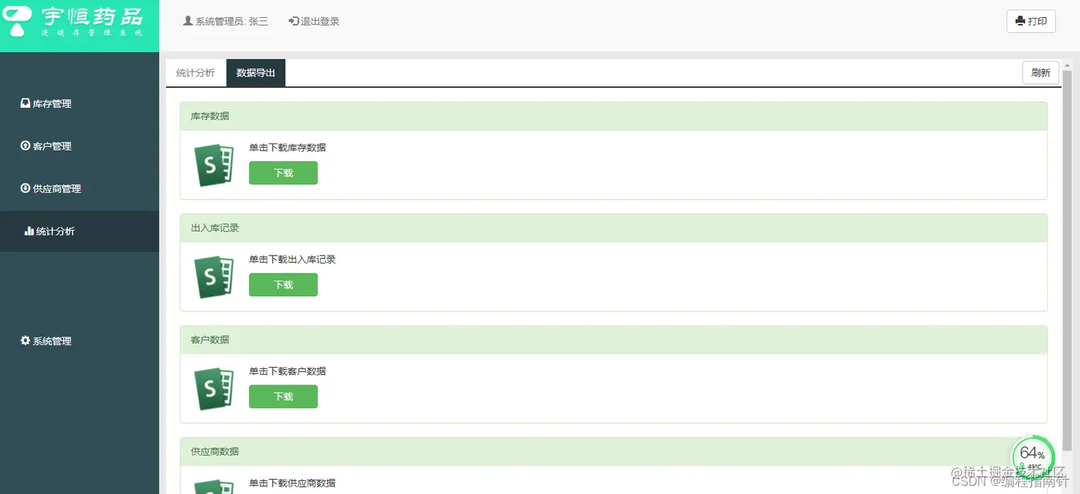 主要实现的功能包含:药品的进销存操作、客户管理、供应商管理、经营数据统计、数据导出、系统管理等模块