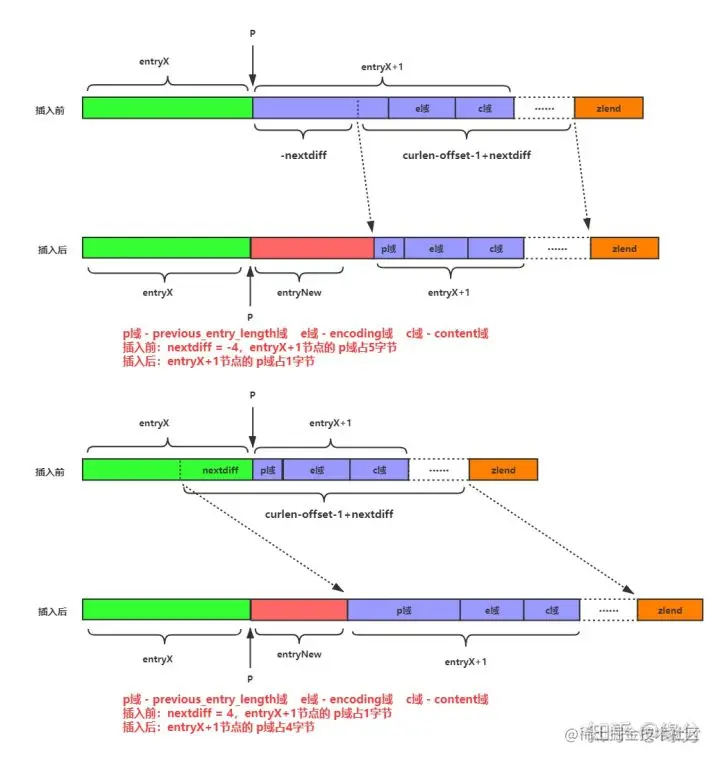 通过指向表尾节点的位置指针p1, 减去节点的previous_entry_length,得到前一个节点起始地址的指针。如此循环,从表尾遍历到表头节点。从表尾向表头遍历操作就是使用这一原理实现的,只要我们拥有了一个指向某个节点起始地址的指针,那么通过这个指针以及这个节点的previous_entry_length属性程序就可以一直向前一个节点回溯,最终到达压缩列表的表头节点。
