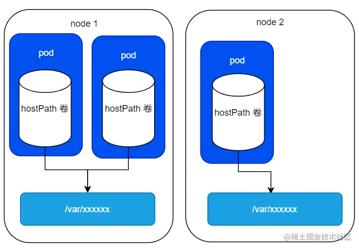 hostPath 卷会指向节点文件系统上的特定文件或者目录,我们同时在一个节点上运行并在 hostPath 卷中使用相同的路径的 pod ,就可以看到相同的文件了