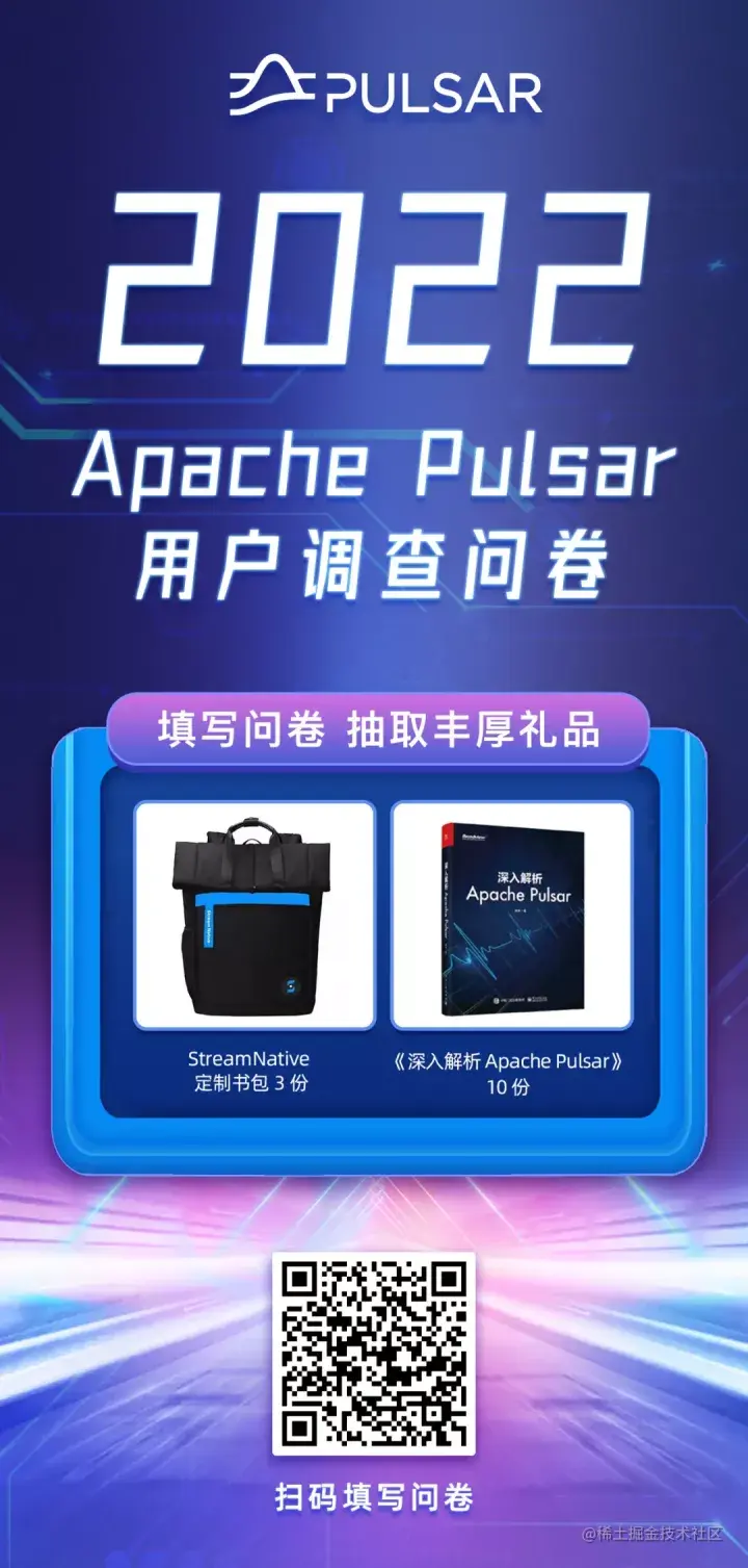 2022 Apache Pulsar 用户调查问卷现在正式发布!欢迎大家填写并传播 2022 Apache Pulsar 用户调查问卷。希望通过这份问卷,综合大家的建议,我们可以在新的一年里更好地建设 Apache Pulsar 社区,打造更完善的 Apache Pulsar 技术生态。在问卷结尾,StreamNative 为大家准备了丰厚的抽奖礼品,赶快扫描下方二维码填写问卷吧👇