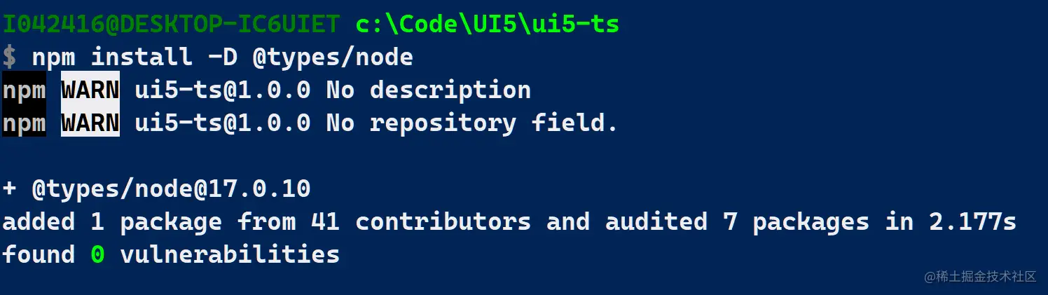 我们安装具体版本,以确保类型定义与使用的 UI5 代码和随附的 jQuery 版本相匹配。