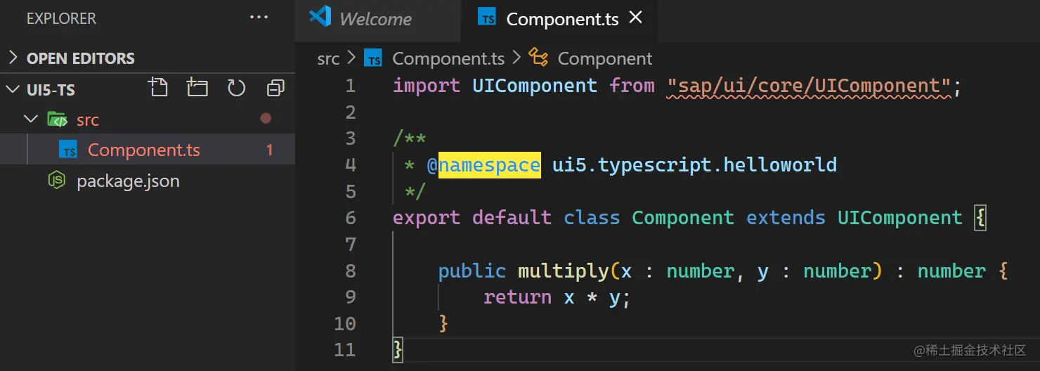 它是 TypeScript 代码,这意味着虽然大部分是纯 JavaScript,但它还包含变量、参数和函数返回值的类型声明,如“multiply”方法的定义所示。 我们马上将能够看到 TypeScript 编译将如何去除这些内容。