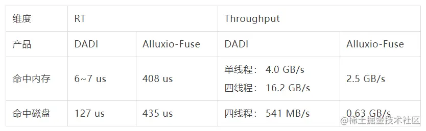 DADI帮助我们实现2个能力,一个是高效的缓存管理,另外一个是统一存储访问。在了解DADI之前,我们可以首先看一下,DADI与开源解决方案从RT与throughput 2个维度做了对比测试: