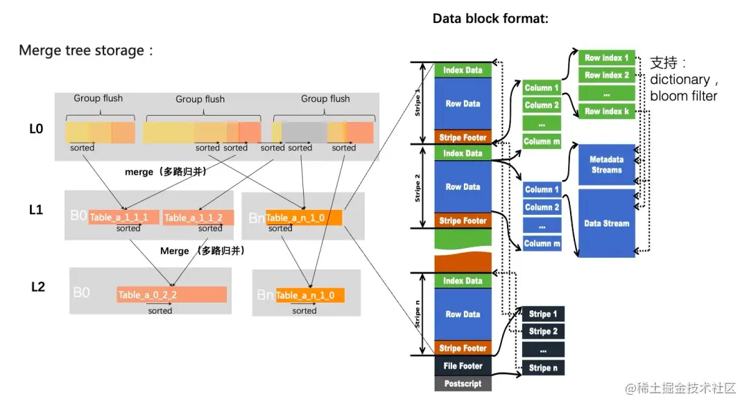 - Group flush:一批写入的数据,可以通过group flush写到同一个OSS文件,我们的OSS文件采用了ORC格式,不同bucket写入到对应strip;