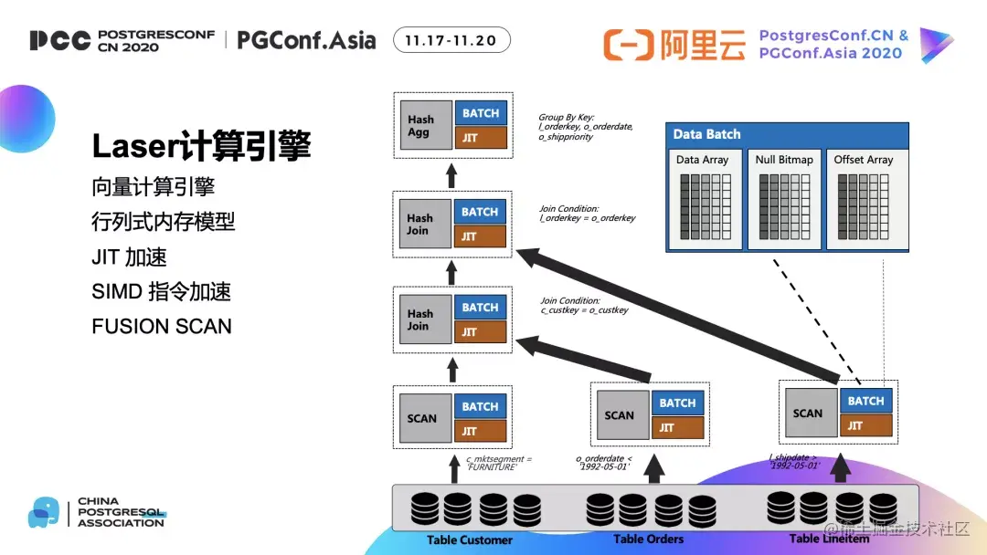 ADB PG云原生版本也同样支持向量化执行引擎,核心还是通过攒批的方式提高数据在CPU cache的命中率,通过codegen减少函数调用次数,减少复杂计算指令跳转,通过SIMD指令加速计算,通过内存池管理,降低算子间的内存拷贝,更多信息可以参考【3】。