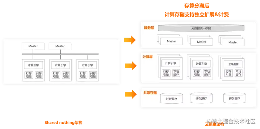 随着云原生的进一步演进,我们提供了全新的存算分离架构,将产品进一步拆分为服务层、计算层和共享存储层,架构图如下: