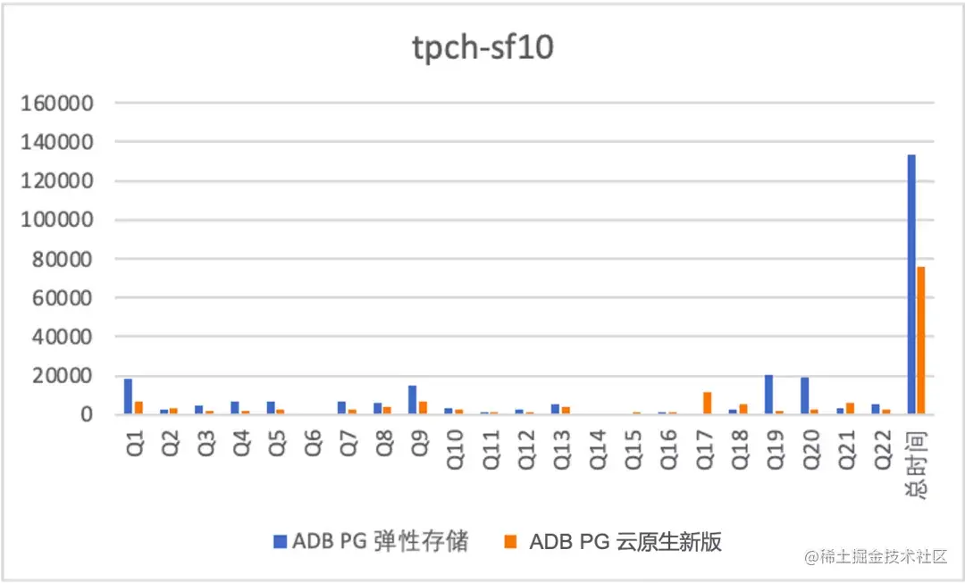 为了测试性能,我们使用了4*4C规格的实例,ADB PG的新版云原生与存储弹性版本做了性能对比测试。