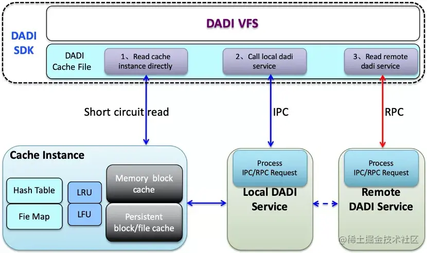 DADI SDK:通过标准读写接口访问存储,通过缓存是否命中,选择短路读(short circuit read),还是IPC进程通信访问Local DADI Service,或者访问远端的DADI Service,对应分布式缓存服务,作为lib库嵌入ADB PG的读写进程;