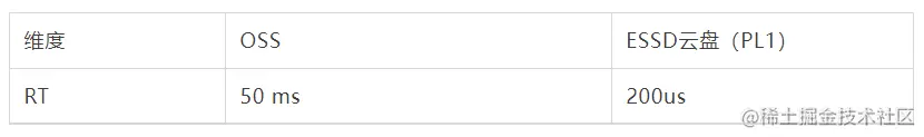 使用OSS的另外一个好处在于按需付费,用户不需要预制存储空间大小,存了多少数据,付多少钱,数据删除后即不再收费;ESSD云盘通常需要根据数据计算存储水位,无法做到将存储资源真正的按需供应,而且无法自动缩容,这些都违背了我们云原生的设计理念。但同时OSS的劣势在于RT: