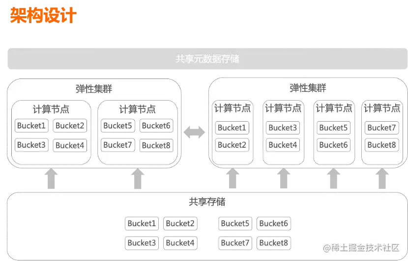 把数据根据hash bucket分成多个分片,按分片粒度在扩缩容的重新映射对象存储上的数据。如果扩容计算节点超过分片个数的时候,只能重分布数据。为了解决这个问题,我们支持hash bucket可以后台分裂和合并,避免重新分布数据。