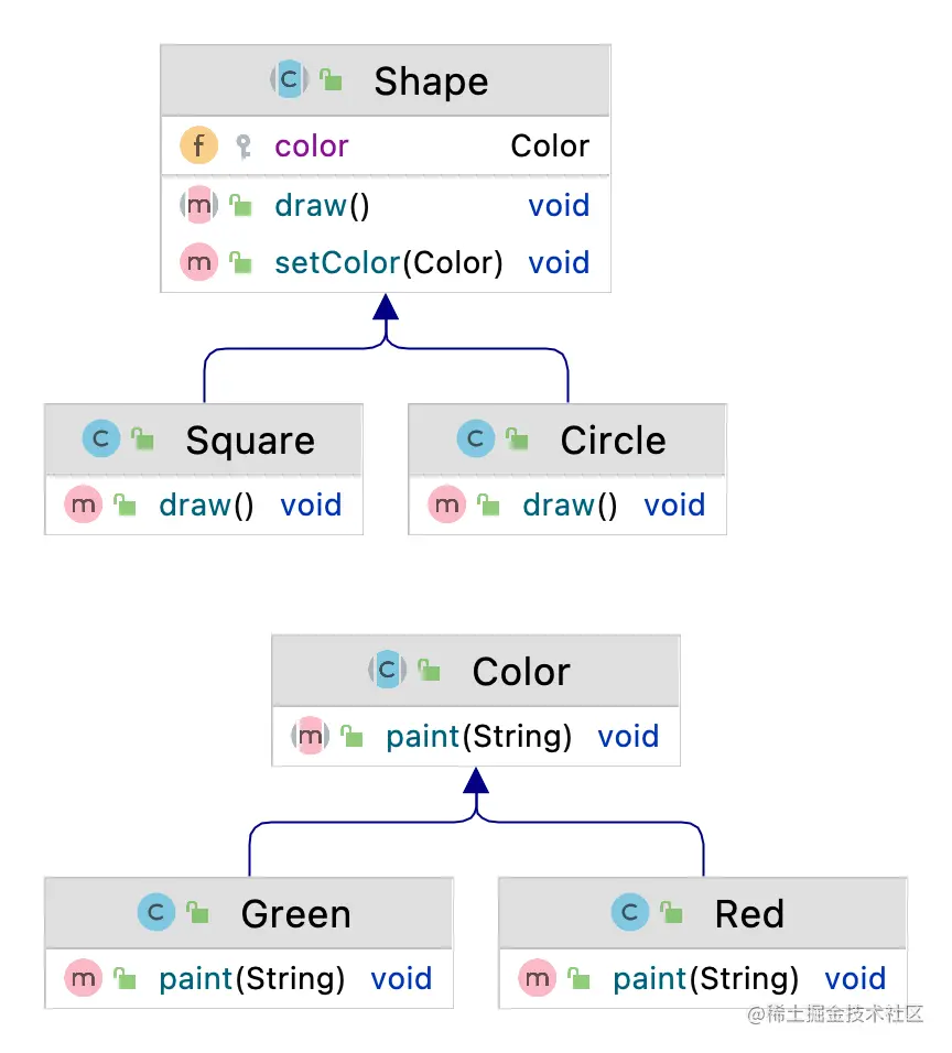 将Color类组合在Shape中来将形状和颜色解耦,各自维护各自的变化,这里体现了组合优于继承的设计原则。
