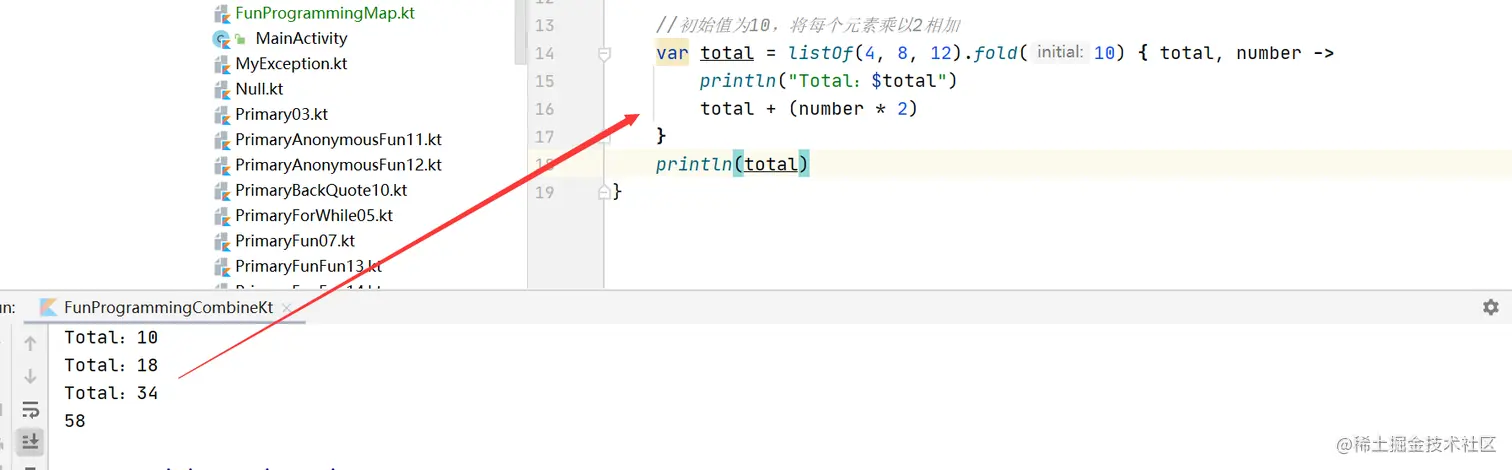 var total = listOf(4, 8, 12).fold(10) { total, number ->