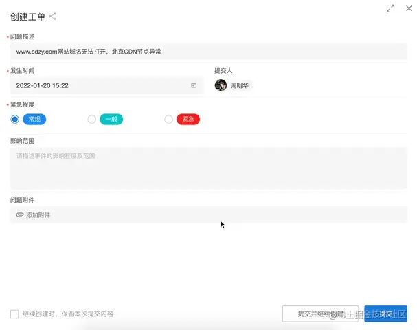 例如,在提交工单反馈时,若填写人选择紧急程度为“紧急”,则要求客户必须描述事件的影响程度及范围,以便客服人员合理评估处理的方式和时间,提高客户满意度。