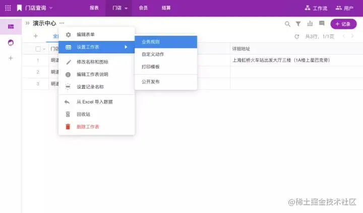在工作表的菜单中增加了「设置工作表」按钮,可以快速打开工作表的「业务规则」、「自定义动作」、「打印模板」和「公开发布」页面。管理员无需先进入编辑表单页面,既可以执行以上操作。