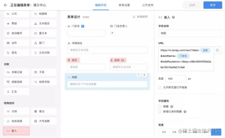 嵌入字段支持在表单中嵌入外部链接,并将当前表单的其他字段值作为参数传入,在表单中实现自定义元素的展示和交互。另外,嵌入字段还可以作为画廊视图的封面。