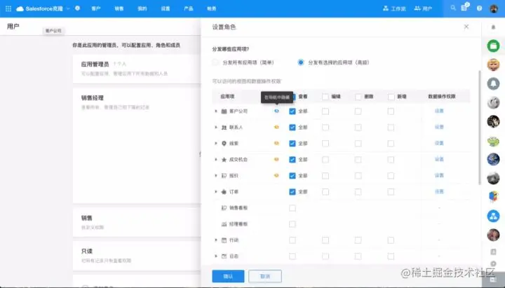 在应用的用户界面里,你可以设置不同角色的应用项显隐效果。针对一些只能在关联记录查看或使用的场景,你可以将它们设为隐藏,从而让导航更简洁易用。
