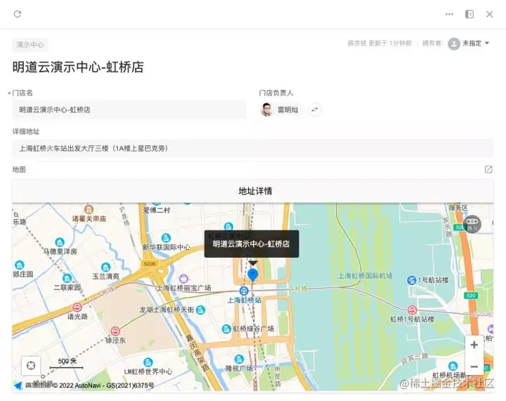 比如:在门店管理的场景中,要想在门店信息表里直接呈现门店位置的地图,就可以通过嵌入【高德开放平台】中的“地图组件-位置标注”实现。