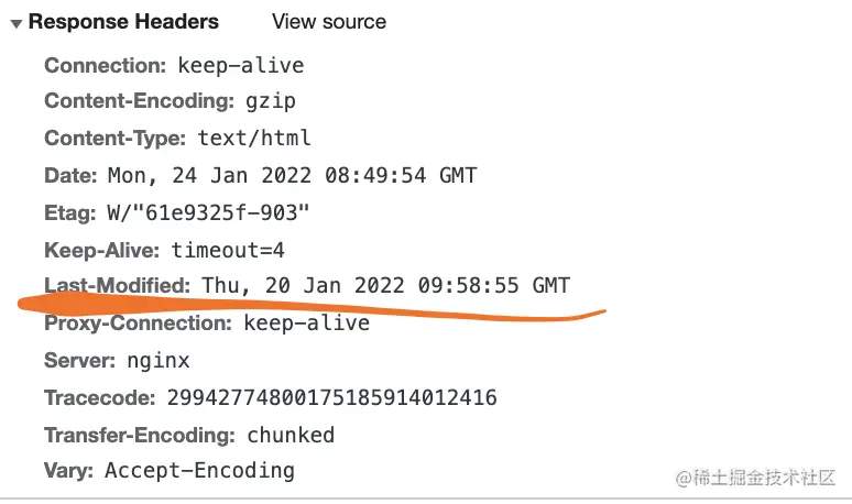 监控平台问题暴露出来后,第一时间对比了同类型的请求,发现使用fetch请求此子应用的html时,相较于其他的子应用html的response header 多了Last-Modified 字段。在我们的认知里,通常Last-Modified是和协商缓存相关,但一些情况下也会触发启发式(heuristic)缓存。