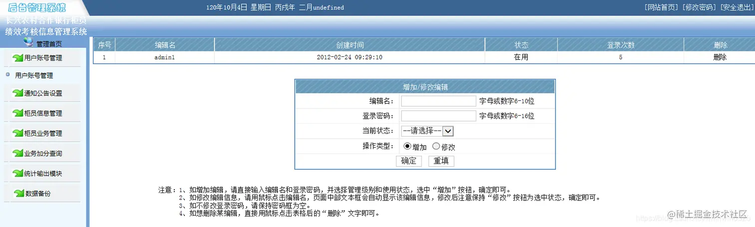 2.3 管理员界面:登入后,记录柜员工作情况:输入柜员工号,柜员名字,记录业务笔数,最后一栏并记录柜员员工加减分情况(笔数处于10的整数部分为加减分情况,以10分为上限)。除此之外,管理员还能对普通柜员的权限进行修改,删除不必要的用户。