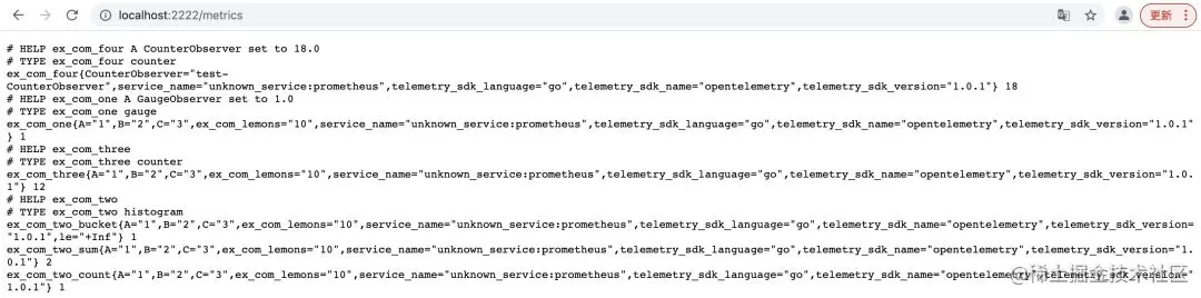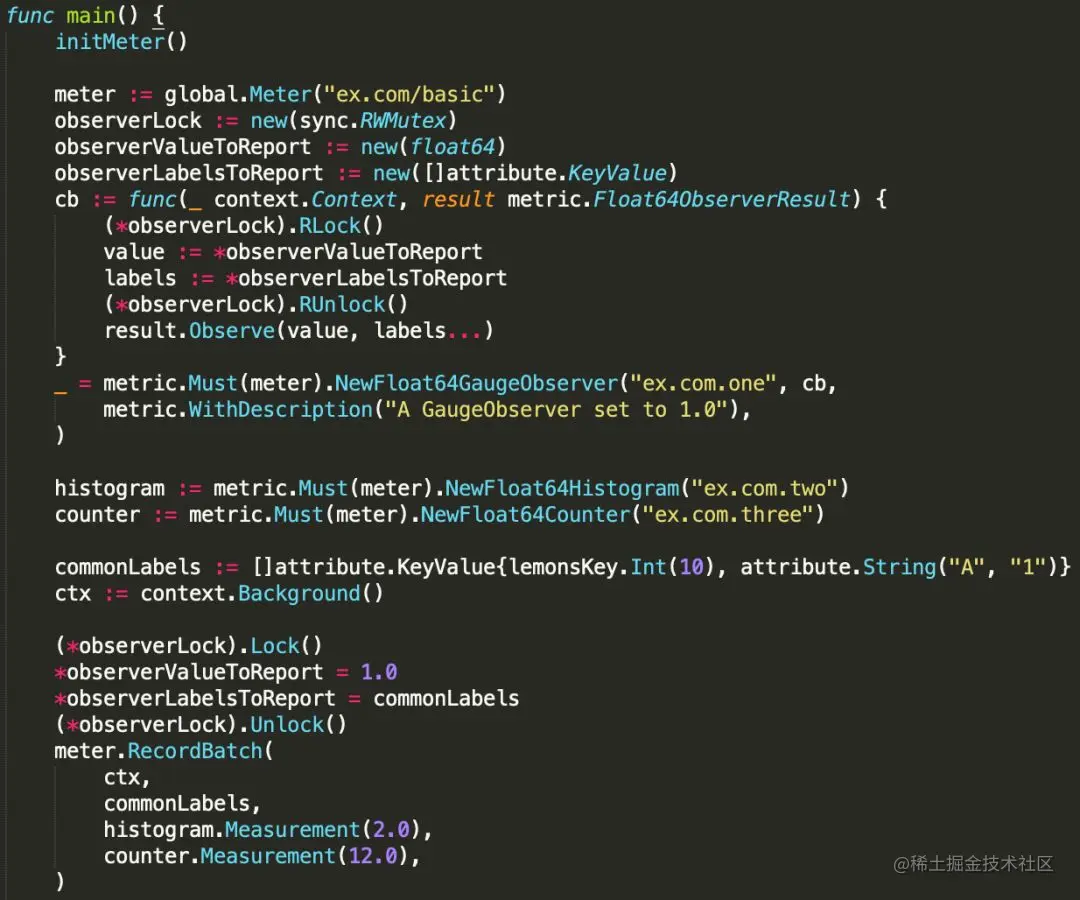 异步:类型匹配到 CounterObserver,UpDownCounterObserver,GaugeObserver。由 SDK 每次的收集周期执行一次异步类型 Instrument 设置的回掉函数,在回掉函数中设置监控数据。如每次收集间隔是,统计一下程序的运行时间。