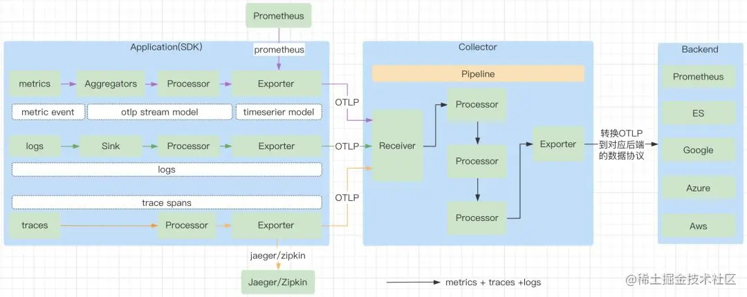 Backend: 负责持久化观测数据,Collector 本身不会去负责持久化观测数据,需要外部系统提供,在 Collector 的 exporter 部分,需要将 OTLP 的数据格式转换成 Backend 能识别的数据格式。目前社区的已经集成的厂商非常多,除了上述的开源的,常见的厂商包括 AWS,阿里,Azure,Datadog,Dynatrace,Google,Splunk,VMWare 等都实现了 Collector 的 exporter 能力。