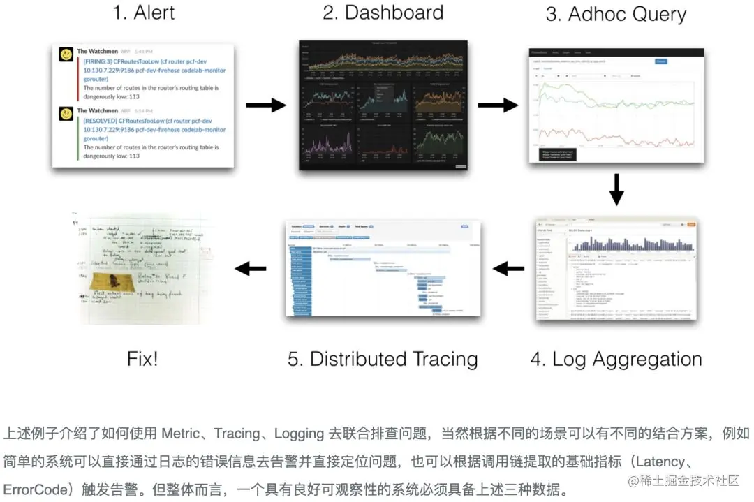 在同一时刻通过 trace id 和 span id 将三大能力串起来。每一个部分都需要有时间,如监控是时序数据库,模式就带时间字段;如日志,日志框架都有时间这个字段;如链路,链路也都是有时间字段的。因为三者在采集的时候,每个模块的执行时机有先后顺序,但是可以保证的是这个时间范围肯定是在这次请求过程中,这样就可以将时间范围缩短到一个很短的时间范围内,来达到精确的定位问题。