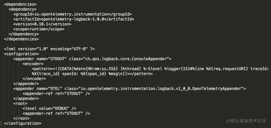 Logback 支持 Trace,引用 OpenTelemetry 提供的 jar 包,以及修改配置文件。